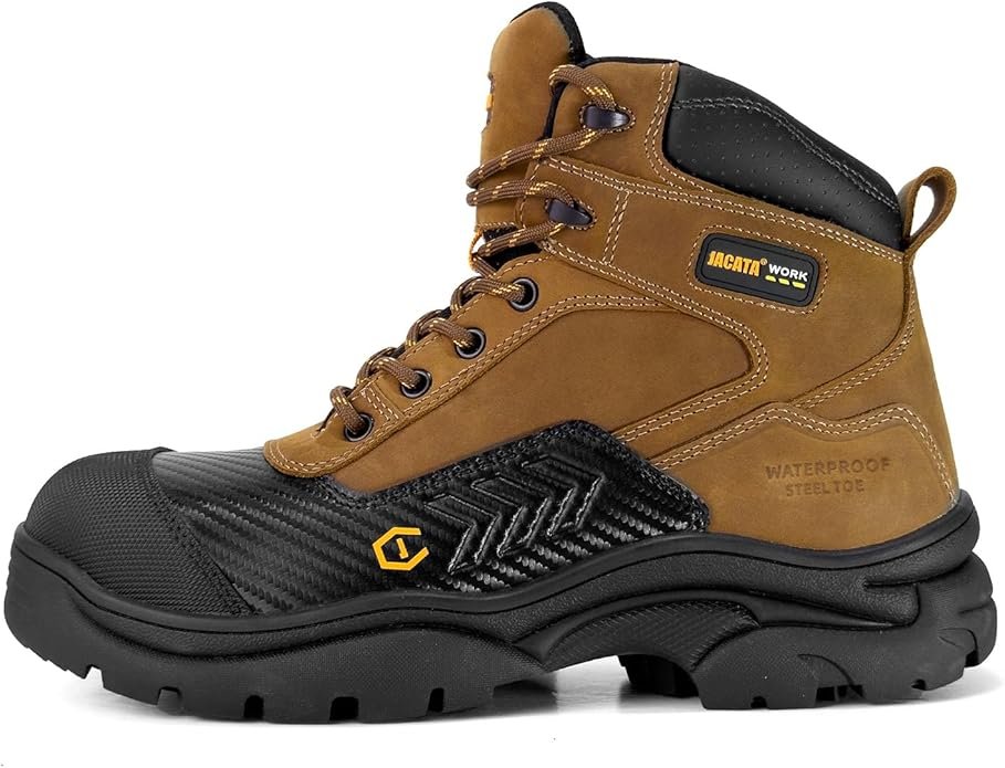 Waterproof Pure Natural Leather : This Jacata work boots upper is made of soft pure natural leather, perfect blend of strong and soft with no break in period lets . Make this mens work boots more comfortable and durability . keep your feet dry, promote air flow and circulation. the moc toe wedge boots be your perfect partner